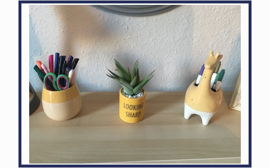 When thinking of desk storage there are plenty of options. If you are looking to maximise space you can find a small set of desk drawers from WHSmith for around £15, which is big enough to store notebooks as well as all of your stationary. Or if you are a bit tighter on space, you can use an array of different jars and pots to store pens and other stationary.