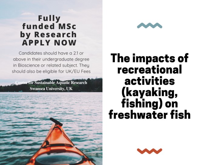 Fully funded opportunity to study the impacts of recreational activities (kayaking, fishing) on freshwater fish. This is a 1-year MSc by Research funded by KESS-II, NRW and Canoe Wales. Tentative start date: 1 July 2021, deadline 4 June 2021.