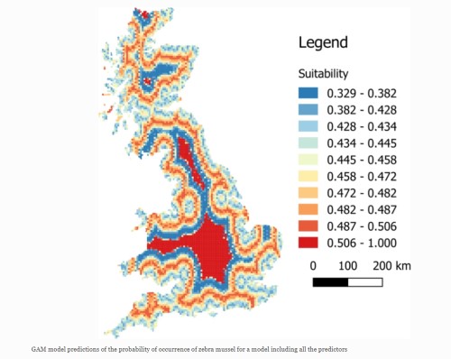 In this study, the research team examined the distribution of the zebra mussel in Great Britain using a model to generate maps that can predict future dispersion. The model shows that distance to boat ramps is the best way to predict the mussel’s distribution - mussels are more likely to be present within 3 km upstream of boat ramps.