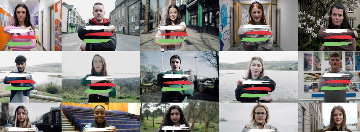 Rhai o fyfyrwyr cyfrwng Cymraeg Prifysgol Abertawe yn llunio neges 2021
