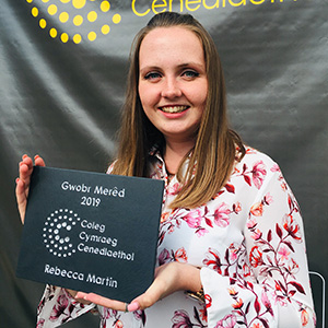 Mewn digwyddiad arbennig yn Eisteddfod Genedlaethol Sir Conwy ym mis Awst derbyniodd un o fyfyrwyr y Gyfadran Dyniaethau a'r Gwyddorau Cymdeithasol, Rebecca Martin, wobr Merêd y Coleg Cymraeg Cenedlaethol eleni a hynny am ei chyfraniad allgyrsiol i fywyd Cymraeg ym Mhrifysgol Abertawe a thu hwnt.