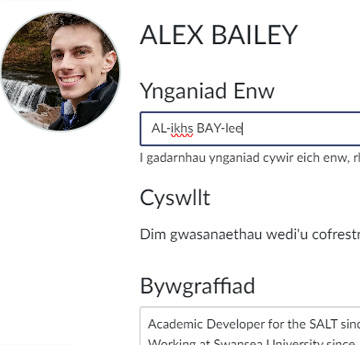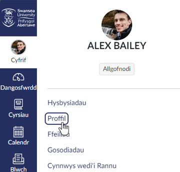 Gallwch helpu eich hyfforddwyr i ynganu eich enw'n gywir drwy ychwanegu ynganiad i'ch Proffil ar Canvas. Cyn ychwanegu eich ynganiad at Canvas dylech ddarllen yr erthygl Wiki-How, 'How to Spell your Name Phoenetically', i'ch helpu i ddyfeisio sillafiad ffonetig cywir o'ch enw.