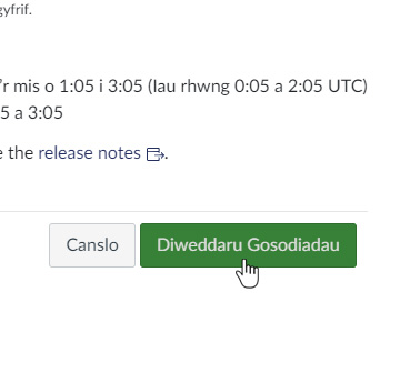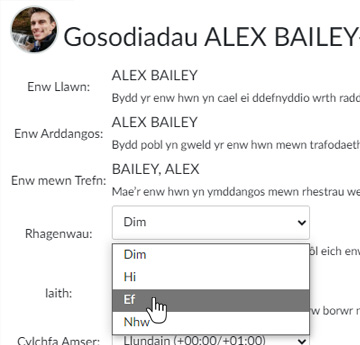 Gallwch nawr ddewis arddangos eich rhagenwau ar eich tudalen Gosodiadau Canvas. Gallwch ddewis rhwng 'Dim', 'Hi', 'Ef' neu 'Nhw'. Bydd eich rhagenwau'n ymddangos mewn cromfachau ar ôl eich enw ble bynnag y dangosir eich enw yn Canvas. Ni fydd unrhyw ragenwau yn cael eu harddangos os ydych chi'n dewis yr opsiwn 'Dim'.