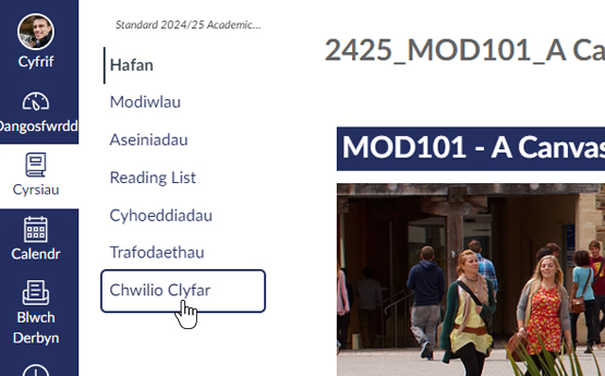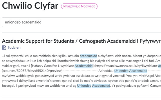 Gellir defnyddio Chwilio Clyfar i chwilio am eiriau allweddol mewn cwrs yn Canvas. Ar hyn o bryd gall dod o hyd i eiriau ar dudalennau Canvas, mewn cyhoeddiadau, trafodaethau, a disgrifiadau o aseiniadau yn y cwrs. Bydd y nodwedd yn cael ei hehangu i gynnwys mwy o fathau o gynnwys yn y dyfodol.