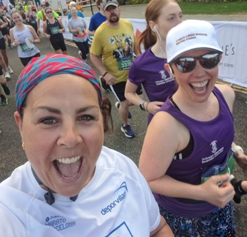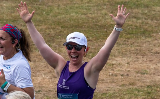 Roedd yn destun cyffro ac ofn i mi! Ond roeddwn i'n dwlu ar fod yn rhan o Dîm Abertawe ac roeddwn i'n edrych ymlaen yn fawr at gasglu fy fest. Roedden ni'n ffodus i gael ein hannerch gan Ryan Jones, cyn-gapten Cymru, a Lowri Morgan, sy'n cymryd rhan mewn gweithgareddau sy'n rhoi prawf ar wytnwch corfforol. Roedd y ddau ohonynt yn llawn ysbrydoliaeth ac rwy'n cofio Lowri'n dweud: “Nid pawb sy'n gallu rhedeg hanner marathon” ac “Mae'n haws rhedeg os ydych chi'n gwenu”. Gwnes i gofio'r cyngor hwnnw pan aeth pethau'n anodd! Rwy'n ffodus bod gen i'r gallu a daliais i ati i wenu. Roedd yn WYCH gweld fy holl gefnogwyr ar y diwedd, yn enwedig fy ngŵr, fy merch a'm ci. Does dim rhybudd ynghylch pa mor emosiynol byddwch chi. Roedd dagrau lu!