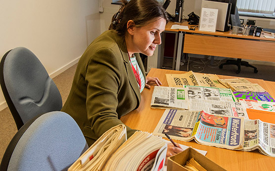 Ymunodd Emily Hewitt â’r Archifau yn 2016 i gatalogio a darparu mynediad at gasgliadau archif y Brifysgol. Mae’n cynnig cyngor ar gasgliadau’r Brifysgol a hanes llafar ac mae hi’n cefnogi ymchwil sy’n ymwneud â’r canmlwyddiant a hanes y Brifysgol.