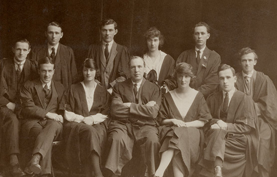 Myfyrwyr Coleg Prifysgol Abertawe mewn gwisg academaidd, c. 1920au. Drwy garedigrwydd Archifau Richard Burton (UNI/SU/PC/5/5)