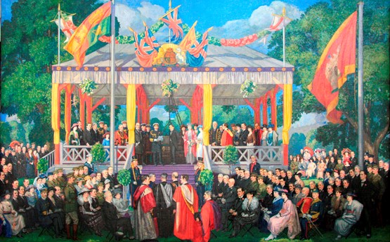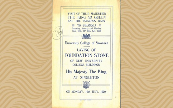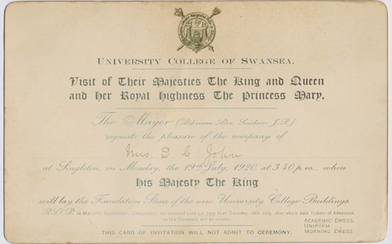 Ar brynhawn ddydd Llun 19 Gorffennaf 1920, cyrhaeddodd Brenin Siôr V a’i wraig ym Mharc Singleton i osod carreg sylfaen Coleg Prifysgol Abertawe. Cynhaliwyd seremoni grand i nodi’r achlysur, gan gynnwys llawer o ffigyrau nodedig o symudiad y Brifysgol yn ogystal â phwysigion y dref a’r rhanbarth, i gyd yn ymgynnull yn y parc i fod yn dystion i’r achlysur. Portreadir yr olygfa mewn paentiad mawr gan Percy Gleaves, y mae’r fersiwn a adferwyd wedi’i harddangos yn Abaty Singleton.
