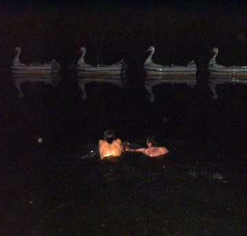 Mae'r atgofion braidd yn niwlog ar sut cafodd y cynllun ei lunio, ond gwirfoddolodd dau o'n grŵp – boed yn ddewr neu'n ddwl – i nofio draw i ynys ganolog y pwll, dadfachu alarch a'i bedlo draw atom ni.