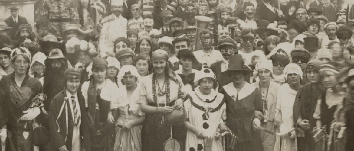 Myfyrwyr mewn gwisg ffansi ar gyfer RAG, 1922. Diolch i Archifau Richard Burton, Prifysgol Abertawe (UNI/SU/PC/5/5)