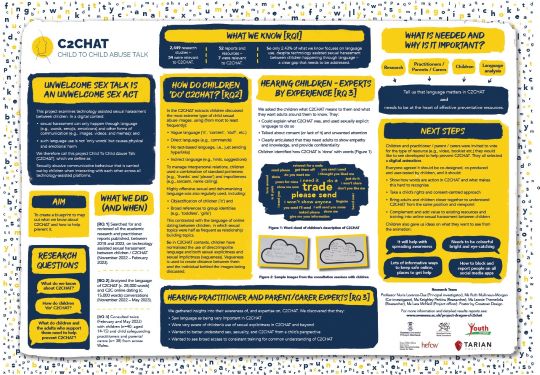 Aflonyddu rhywiol ar-lein, rhwng cymheiriaid yw ymddygiad rhywiol digroeso rhwng plant a phobl ifanc a geir ar lwyfannau digidol. Yn hollbwysig, caiff ymddygiad o'r fath ei sianeli drwy gyfathrebu. Hynny yw, mae'n digwydd drwy sianelau ysgrifenedig (bygythiadau rhywiol, ceisiadau rhywiol, etc.) - boed ar lafar/wedi'i gofnodi neu ei deipio) a gweledol (lluniau, dolenni i fideos etc.). Mae C2CHAT yn arloesi ym maes dadansoddi cyfathrebu rhwng plant a phobl ifanc, gyda ffocws ar iaith, yng nghyd-destun aflonyddu rhywiol ar-lein rhwng cymheiriaid. Caiff y canlyniadau eu hintegreiddio mewn ffordd synergyddol â’r rhai hynny sy'n deillio o gyd-greu gweithdai gyda phlant a phobl ifanc, ymarferwyr diogelu plant a rhieni/gofalwyr. Ar y cyd, maent yn helpu i lywio datblygiad adnoddau hyfforddi i ymarferwyr diogelu plant a rhieni/gofalwyr i'w helpu i gefnogi plant a phobl ifanc a thrwy hynny, frwydro yn erbyn aflonyddu rhywiol ar-lein rhwng cymheiriaid.
