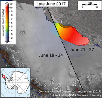 Gan ddefnyddio delweddu lloeren, geoffiseg maes a modelu cyfrifiadurol, mae aelodau o grŵp rhewlifeg Prifysgol Abertawe gan gynnwys yr Athrawon Adrian Luckman a Bernd Kulessa a Dr Steph Cornford wedi bod yn ymchwilio i Rewlifoedd yr Antartig am dros ddegawd a'u sefydlogrwydd yn y dyfodol. Gan ganolbwyntio ar ysgafell iâ Larsen C, maent wedi gwella ein dealltwriaeth o strwythur a deinameg yr ysgafell iâ ac maent wedi bod yn monitro holltau a thoriadau a allai arwain at golli iâ. Gan ddefnyddio'r cyfryngau cymdeithasol a gwefannau dynodedig, maent wedi ymgysylltu â'r cyfryngau a'r cyhoedd i amlygu prosesau a newidiadau yn systemau'r ysgafellau iâ hyn.
