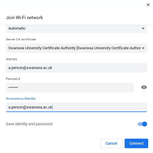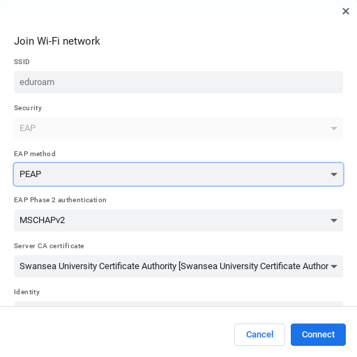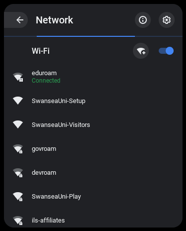 Cysylltu â gwasanaeth Wi-Fi Prifysgol Abertawe gan ddefnyddio dyfais Chromebook