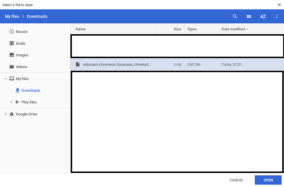 - Dewiswch y ffeil ONC eduroam a chliciwch ar Agor.