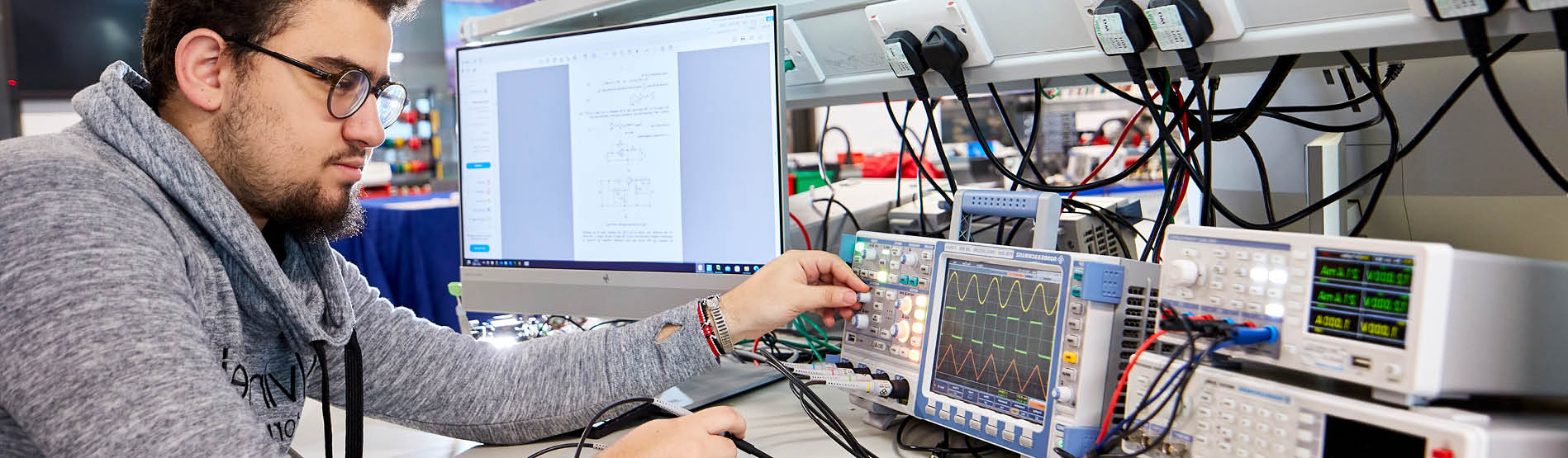 Gallwch fagu profiad ymarferol o weithio ag osgilosgopau digidol, gorsafoedd sodro a generaduron signalau. Byddwch yn dod yn gyfarwydd â nifer o labordai, o'n labordy electroneg ein hunain a'r cyfleuster gwneuthuro byrddau cylched brintiedig, i labordy Electroneg Pŵer a Systemau Pŵer (PEPS) Wolfson, a'r labordy Dinas Glyfar ac Antena.