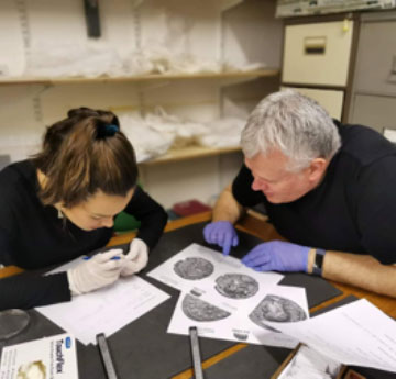 llun yn dangos Dr Pollard yn dysgu myfyriwr am ddarnau arian Rhufeinig