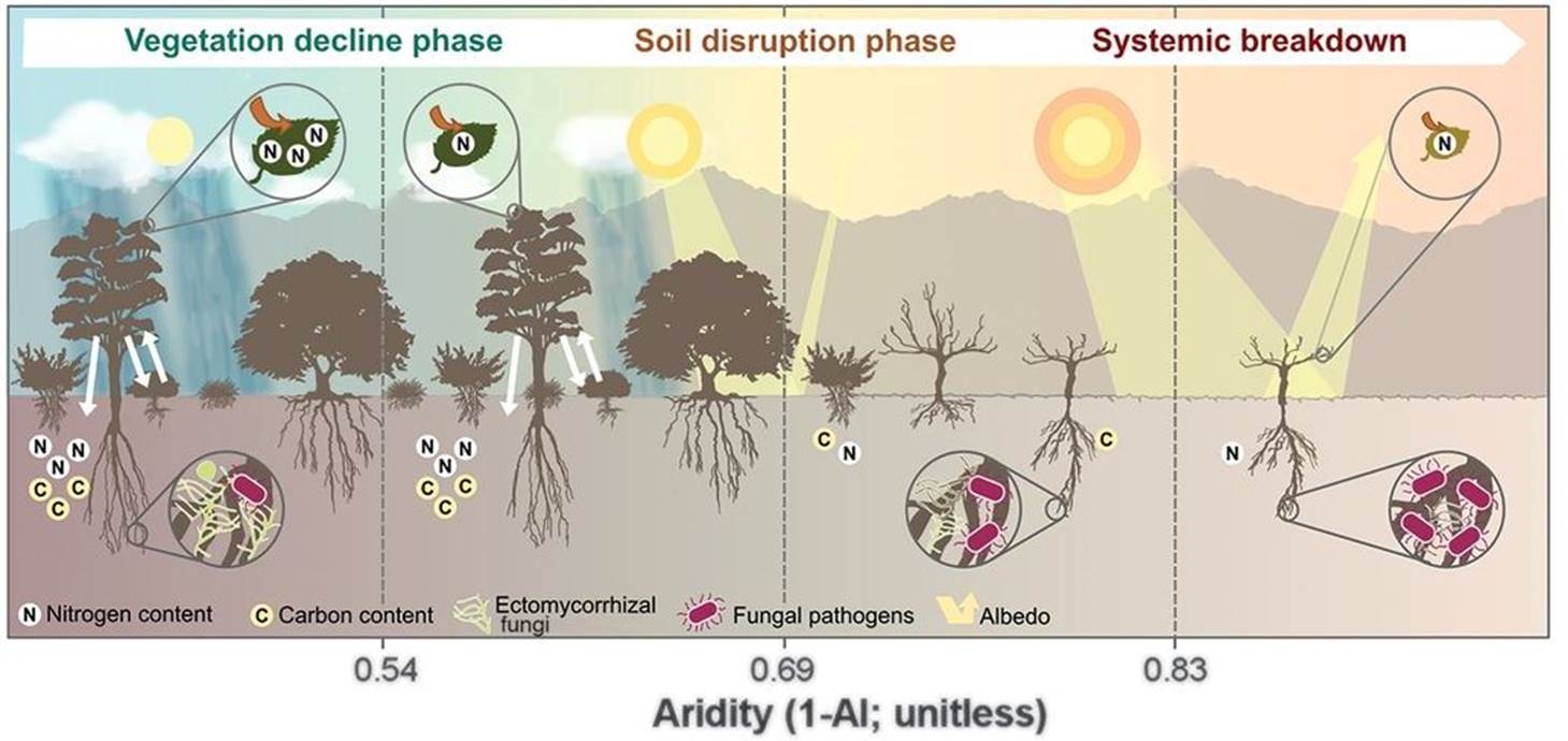 Nododd yr astudiaeth dri chyfnod o newid cyflymach yn yr ecosystem mewn ymateb i gynnydd mewn crinder, a fesurwyd fel y gymhareb wrthdro rhwng glawiad a'r gyfradd y mae dŵr yn anweddu o'r tir i'r atmosffer. Mae'r mynegai hwn yn amrywio mewn tiroedd sych o 0.35 i 1, ac mae gwerthoedd uwch y mynegai yn dangos amodau caletach o ran argaeledd dŵr.