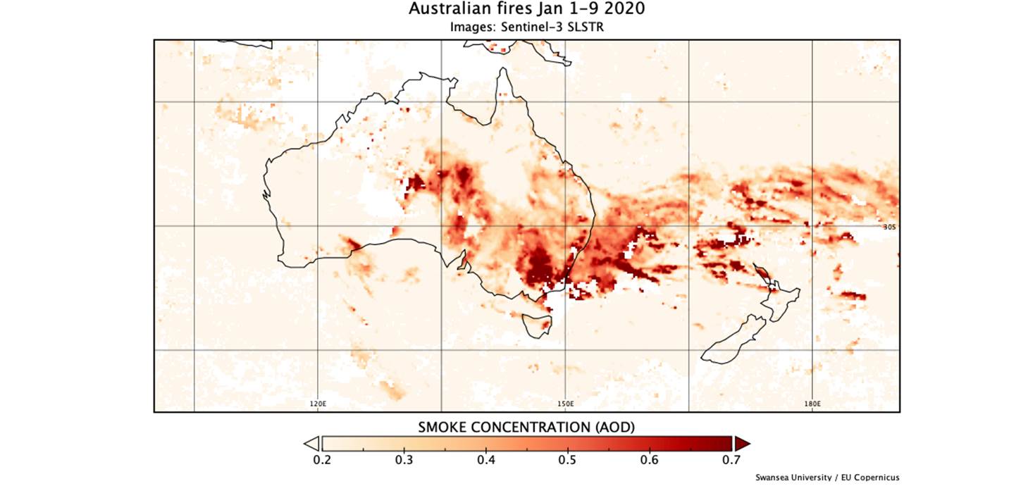 Yn ogystal, ystyrion nhw gyfanswm colofn dwysedd mwg a roddir drwy Ddyfnder Optegol Erosol (AOD), sef mesuriad o ddal golau’r haul, gan ganfod er bod lefelau cyffredinol Awstralia dan 0.2, mae delweddau’r lloeren yn dangos bod hanner y cyfandir yn mynd ymhell y tu hwnt i’r lefel hon ac yn codi i dros 0.7 mewn ardaloedd mawr.