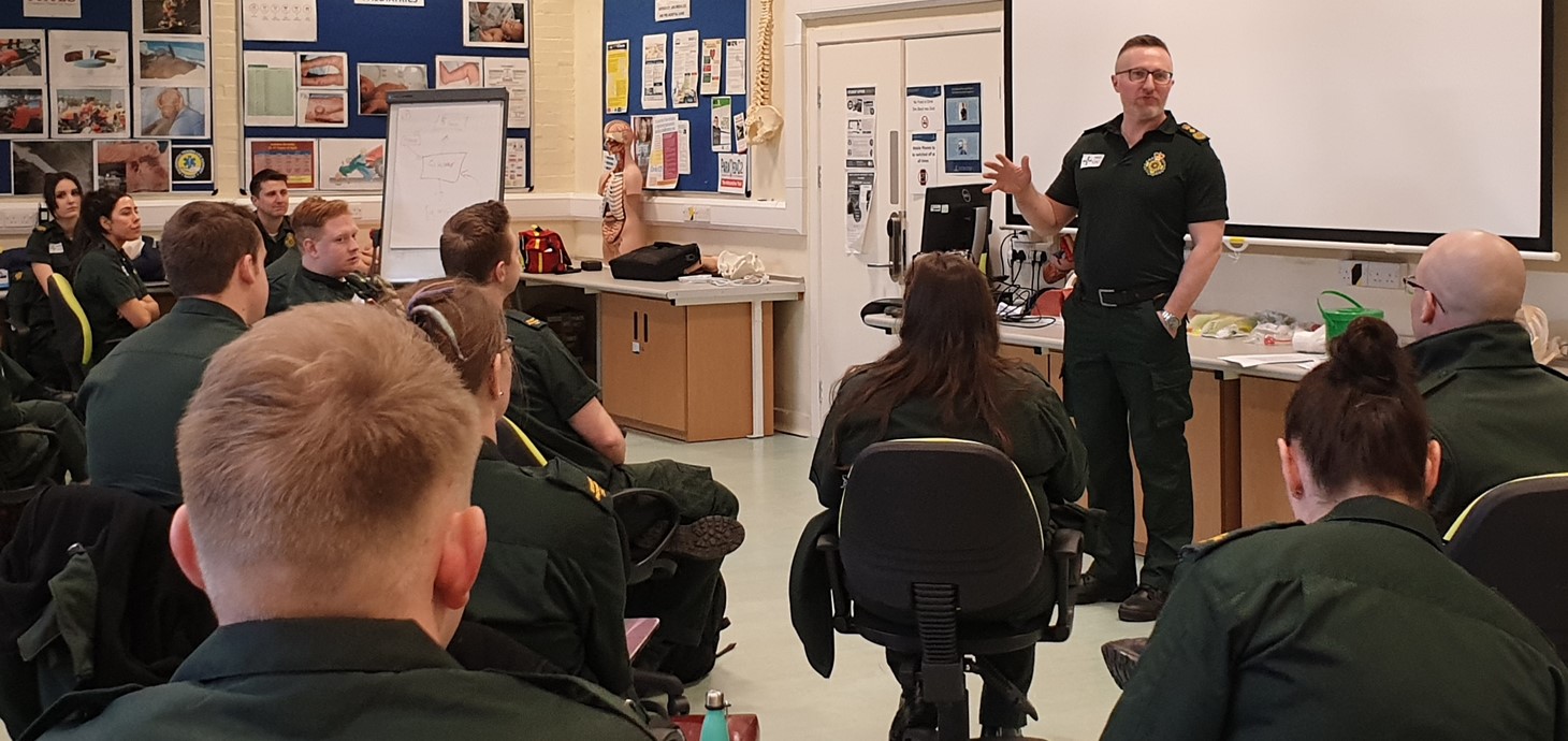 Jason Killens, o Wasanaeth Ambiwlans Cymru, yn siarad gyda myfyrwyr parafeddyg Prifysgol Abertawe am y swyddogaethau y byddant yn eu cyflawni.