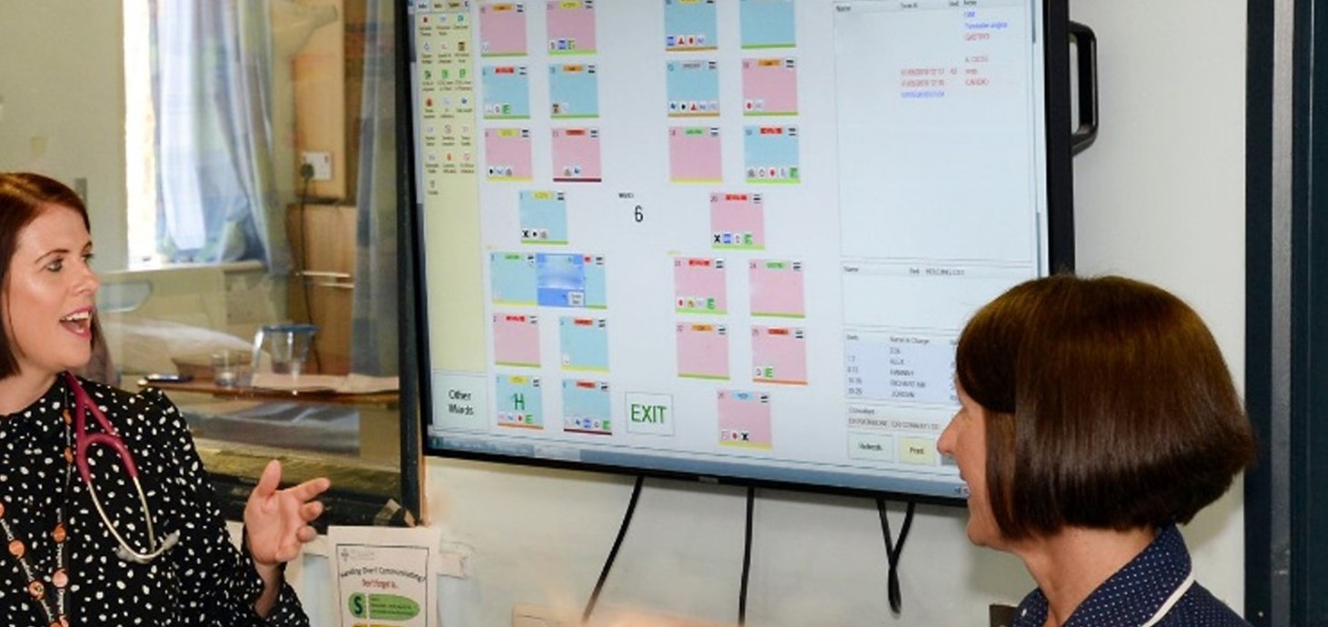 Mae staff yn y Ganolfan Technoleg Gofal Iechyd (HTC) yn helpu i ddatblygu e-fyrddau gwyn newydd sbon y gellir eu defnyddio i gofnodi manylion iechyd pwysig tra bydd claf ar y ward.