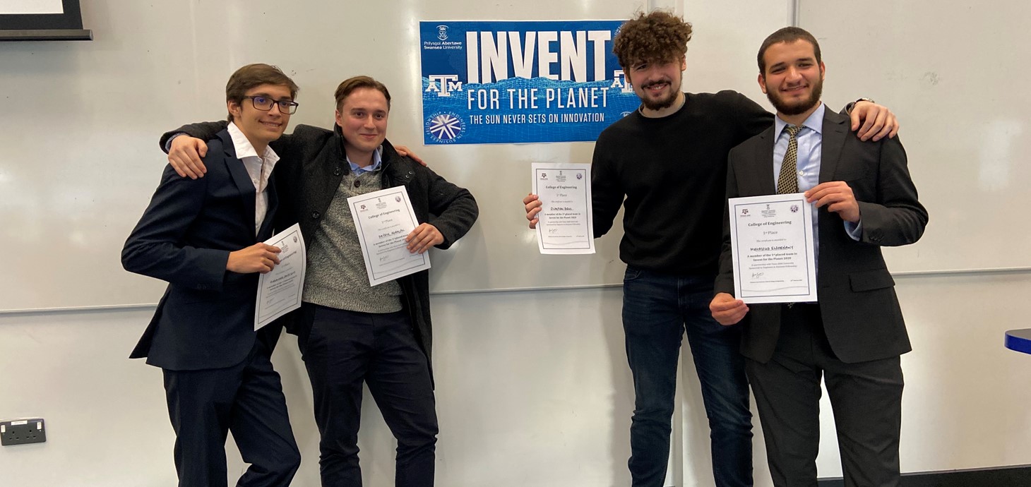 Roedd y myfyrwyr yn rhan o chwe thîm yn Abertawe i gymryd rhan mewn “Dyfeisio Dros y Blaned”, sef profiad dylunio dwys dros 48 awr a arweinir gan Texas A&M University, un o brifysgolion gorau UDA.