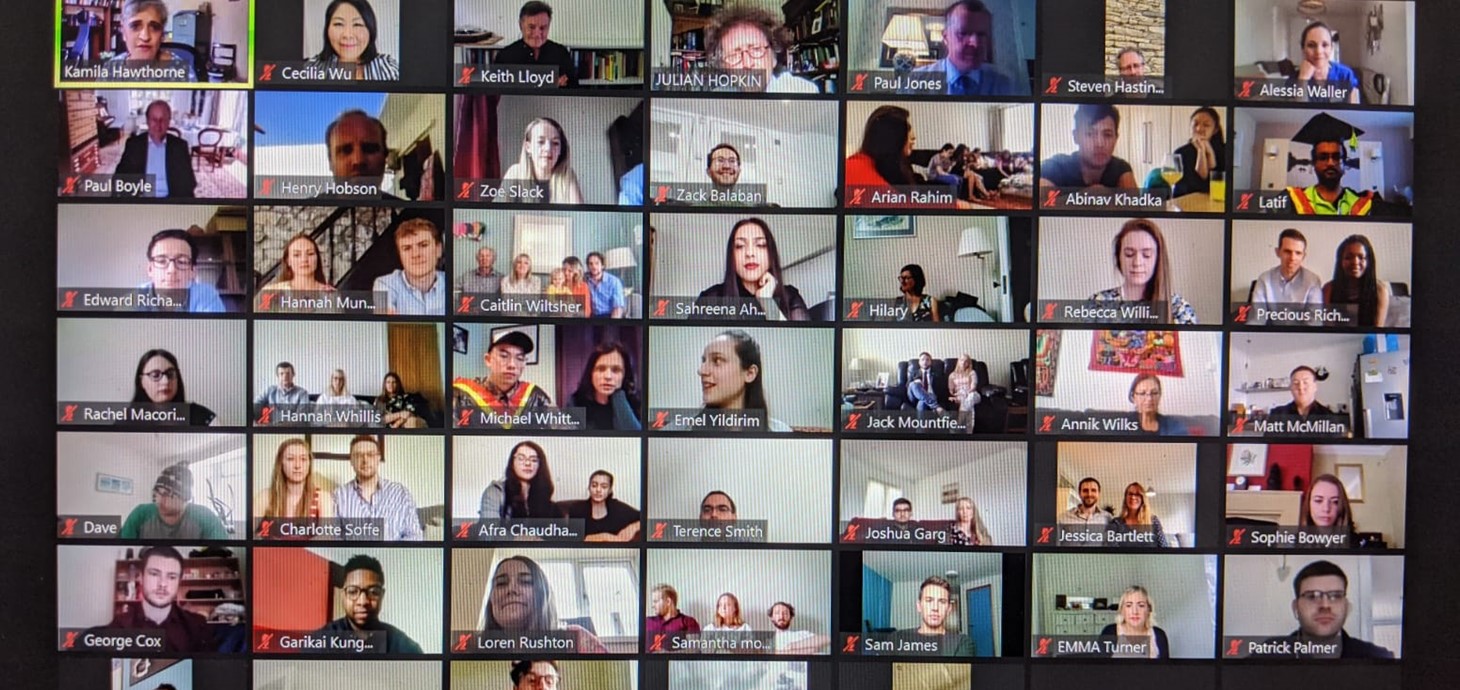 Ymunodd y cyfranogwyr – ar y cyd â rhai rhieni balch – ag uwch-aelodau o staff ar ffurf rithwir ar gyfer y seremoni raddio gyntaf erioed a gynhaliwyd gan y Brifysgol drwy gynhadledd fideo.
