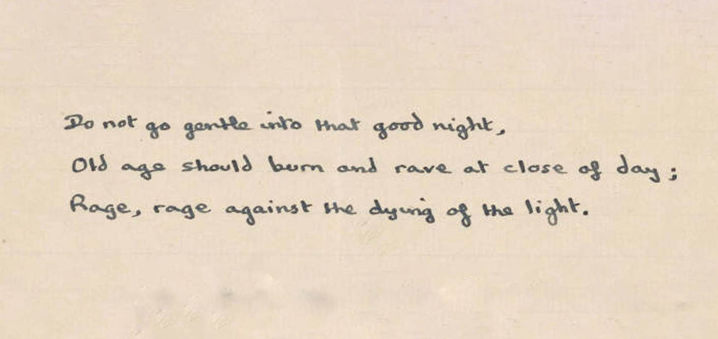 Mae'r casgliad yn cynnwys llawysgrif un o gerddi enwocaf Thomas, Do Not Go Gentle Into That Good Night.