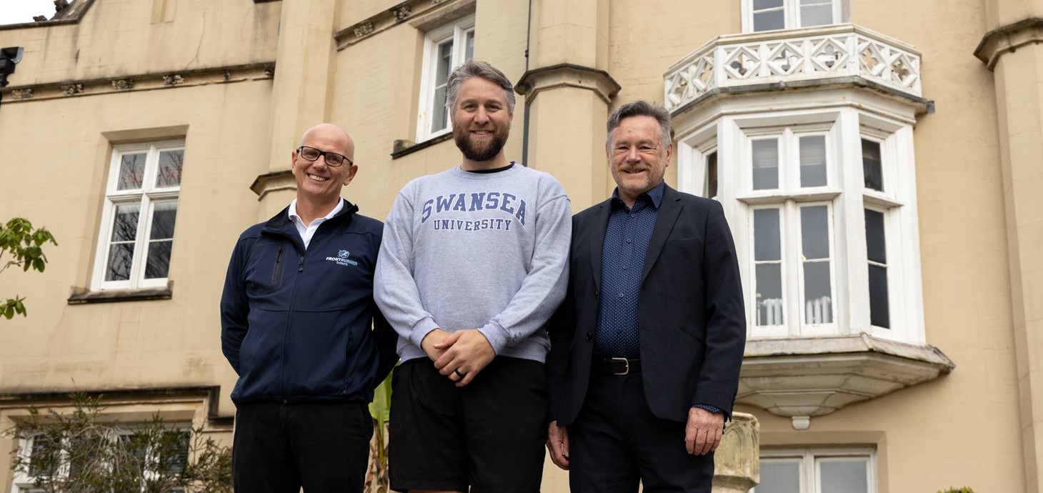 O'r chwith i'r dde: David Martin-Jewell, rheolwr gyfarwyddwr Front Runner Events, Ryan Jones, a'r Athro Keith Lloyd o Brifysgol Abertawe