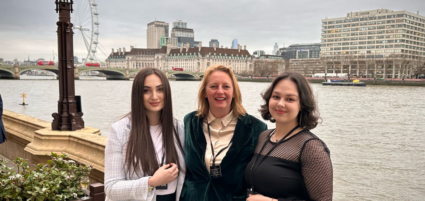 Mariia Hryhorian, Emma Frearson Emmanuel, Cyfarwyddwr Cysylltiol Marchnata, Recriwtio a Rhyngwladol ym Mhrifysgol Abertawe, a Daryna Popova yn y derbyniad yn Nhŷ'r Arglwyddi.