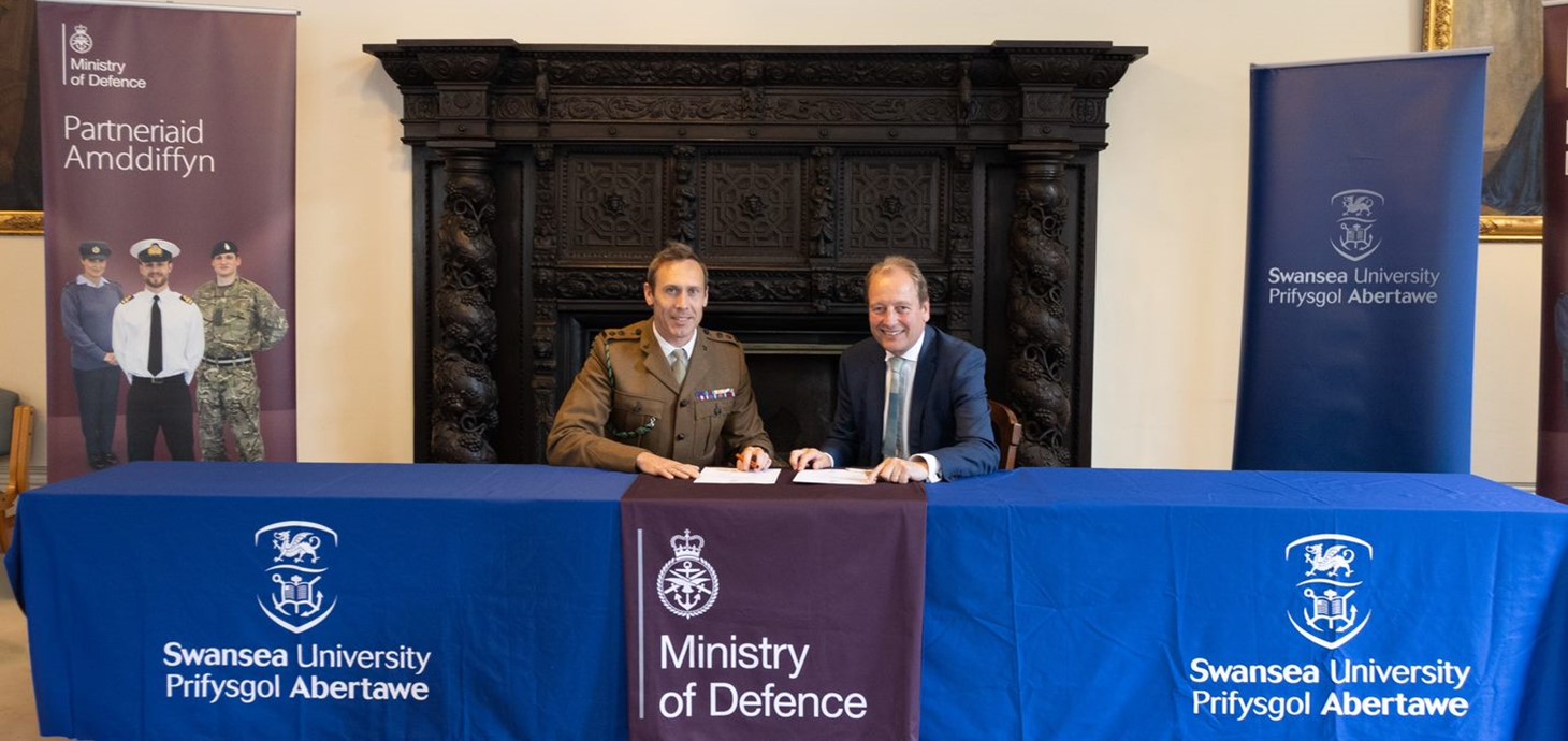 Croesawodd yr Athro Paul Boyle, Is-ganghellor Prifysgol Abertawe, gynrychiolwyr i'n prifysgol cyn llofnodi Cyfamod y Lluoedd Arfog ar y cyd â’r Is-gyrnol Andrew Child, Pennaeth Milwrol Corfflu Hyfforddiant Swyddogion Prifysgolion Cymru.