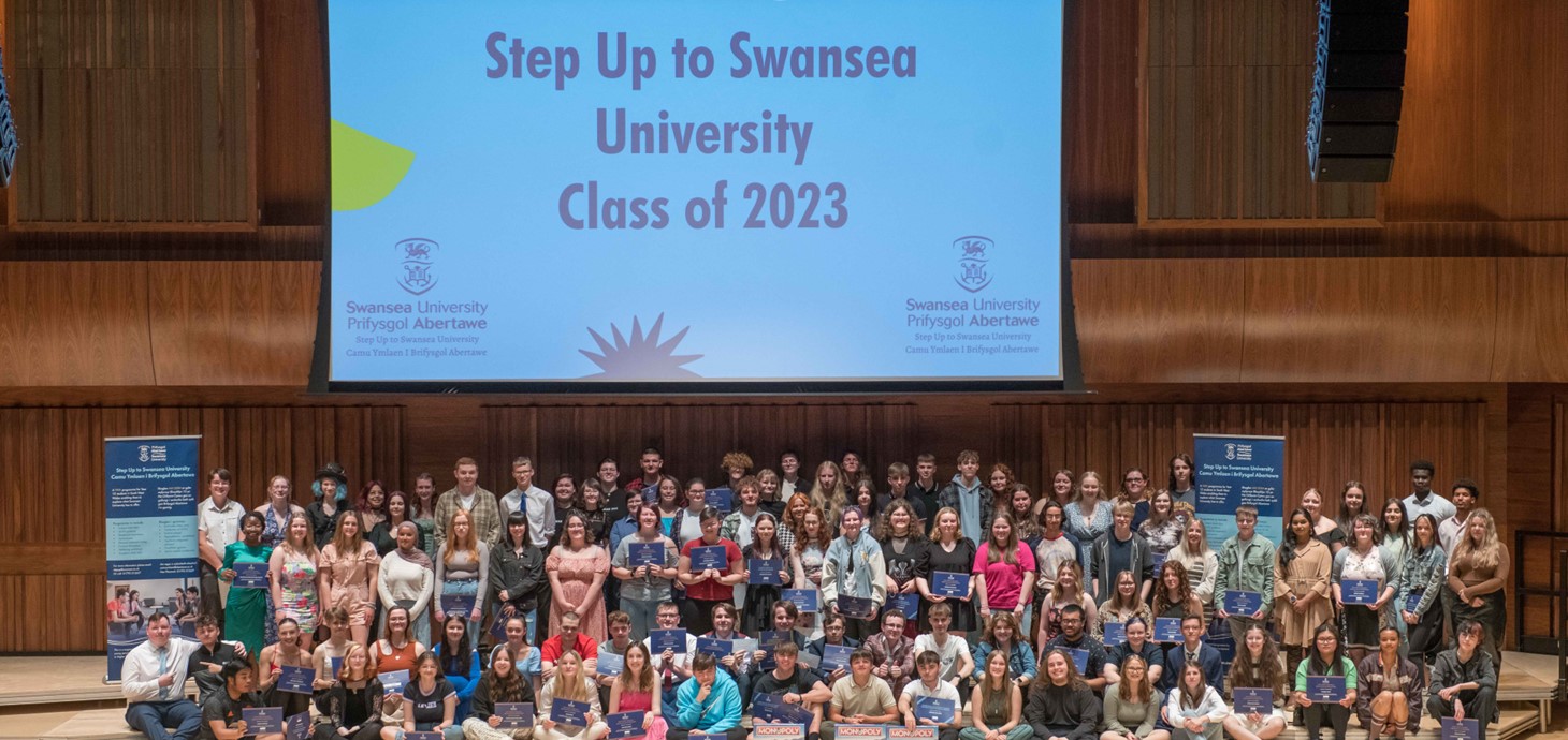 Mae mwy na 100 o bobl ifanc wedi dod ynghyd â'u teuluoedd a'u ffrindiau i ddathlu graddio o Raglen Camu Ymlaen i Brifysgol Abertawe mewn seremoni arbennig iawn yn Neuadd Fawr Prifysgol Abertawe.