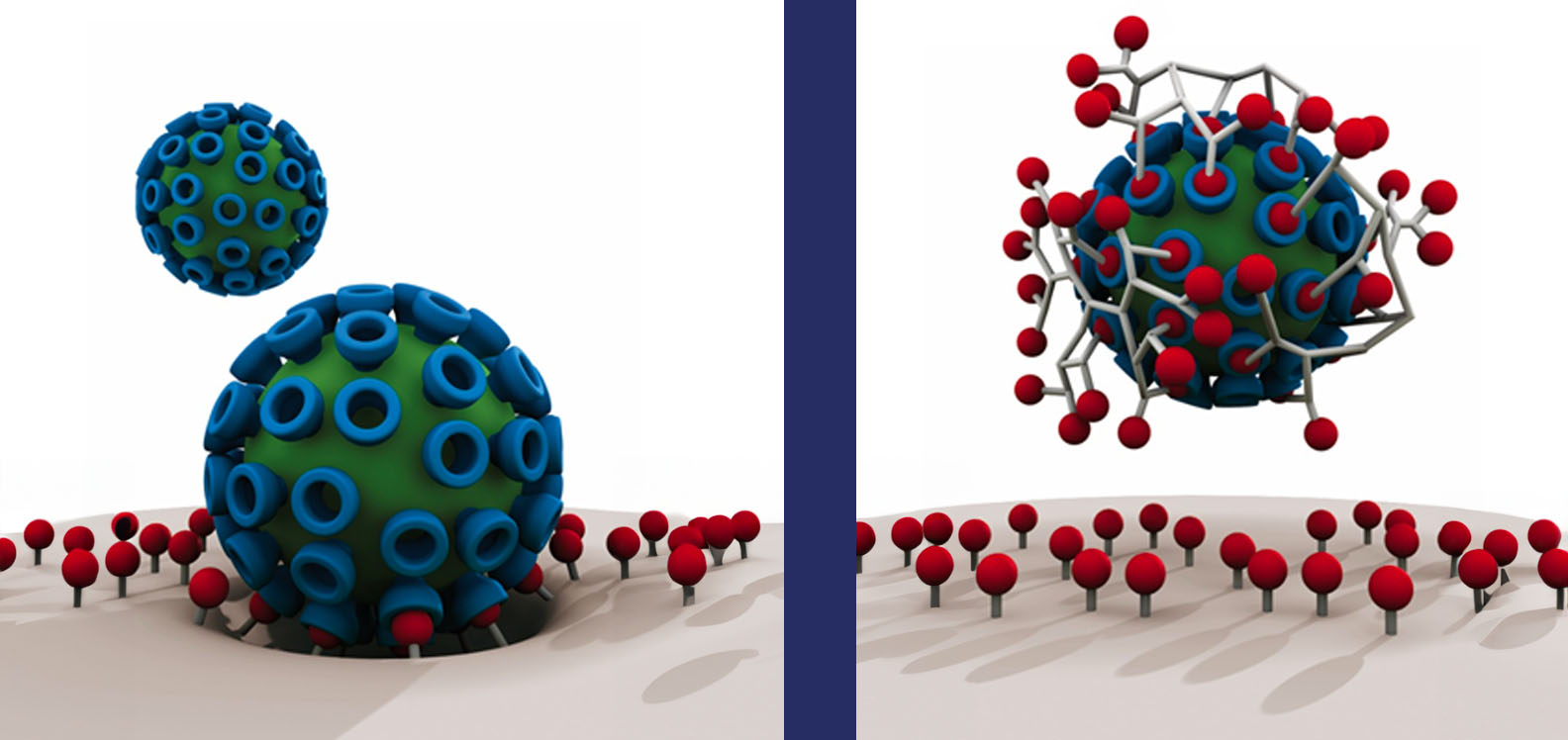 Ar y chwith: Feirws yn glynu wrth arwyneb cell gan ddefnyddio derbynyddion amryfal. Ar y dde: Macro-foleciwl yn dynwared derbynyddion arwyneb cell, gan atal y feirws yn gyfan gwbl.