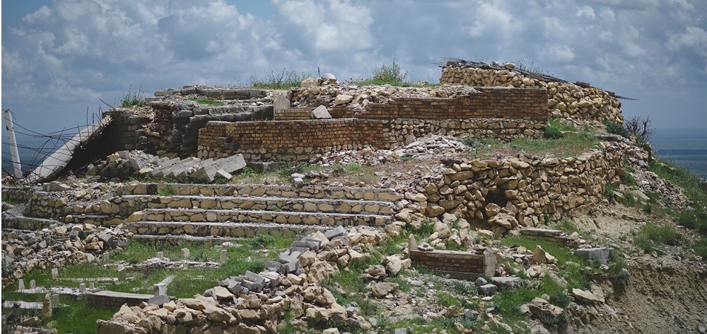Cysegr Yazidi Mame Reshan yn Shingal, Irac, ar ôl i Islamic State ei dinistrio, credyd: Levi Clancy. Mae treftadaeth ddiwylliannol fel safleoedd cysegredig yn hanfodol ar gyfer hunaniaeth ac iechyd meddwl pobl sydd wedi'u dadleoli.