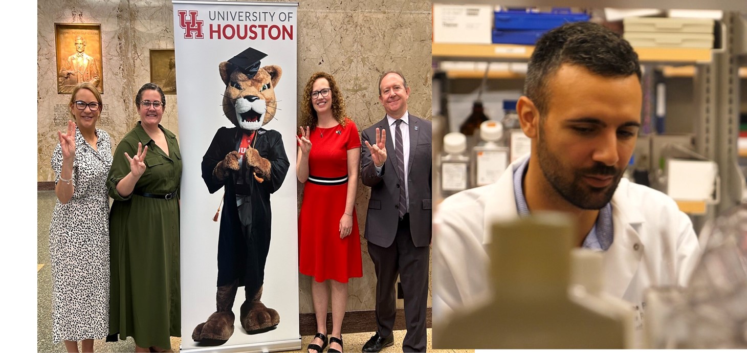 Partneriaeth: chwith, University of Houston, gyda (o'r chwith) Dr Caroline Coleman Davies, Maggie Mahoney (UH), Yr Athro Lisa Wallace, Michael Pelletier (UH); de, Houston Methodist Research Institute gyda ymchwilwr PhD gydweithredol Simone Pisano yn y llun.