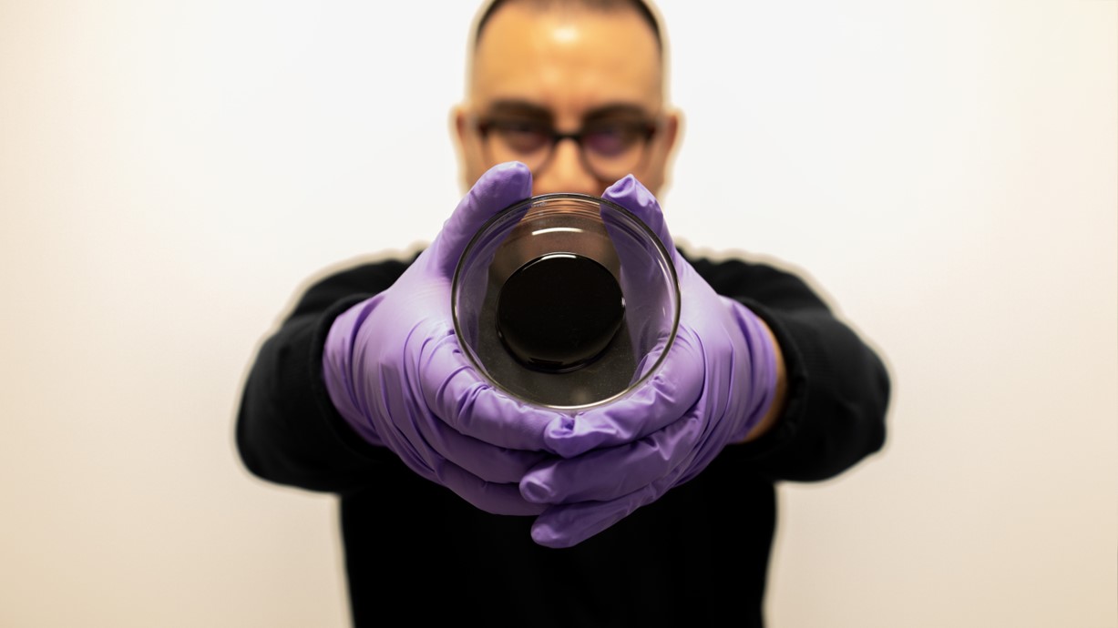Mewn arbrofion yn y labordy, dangoswyd bod y bitwmen hunan-adfer – y deunydd du gludiog yn y gymysgedd asffalt yn nwylo Dr Jose Norambuena-Contreras yn y llun uchod - yn gwella craciau bach yn llwyr ar ei arwyneb mewn llai nag awr.