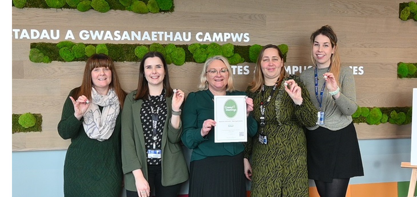 Tîm Digwyddiadau Prifysgol Abertawe gyda Gwobr Twristiaeth Werdd: (o'r chwith) Melissa Ferreira, Charlotte Rees, Michelle Dene, Gwyneth Thomas, Beth Morgan.