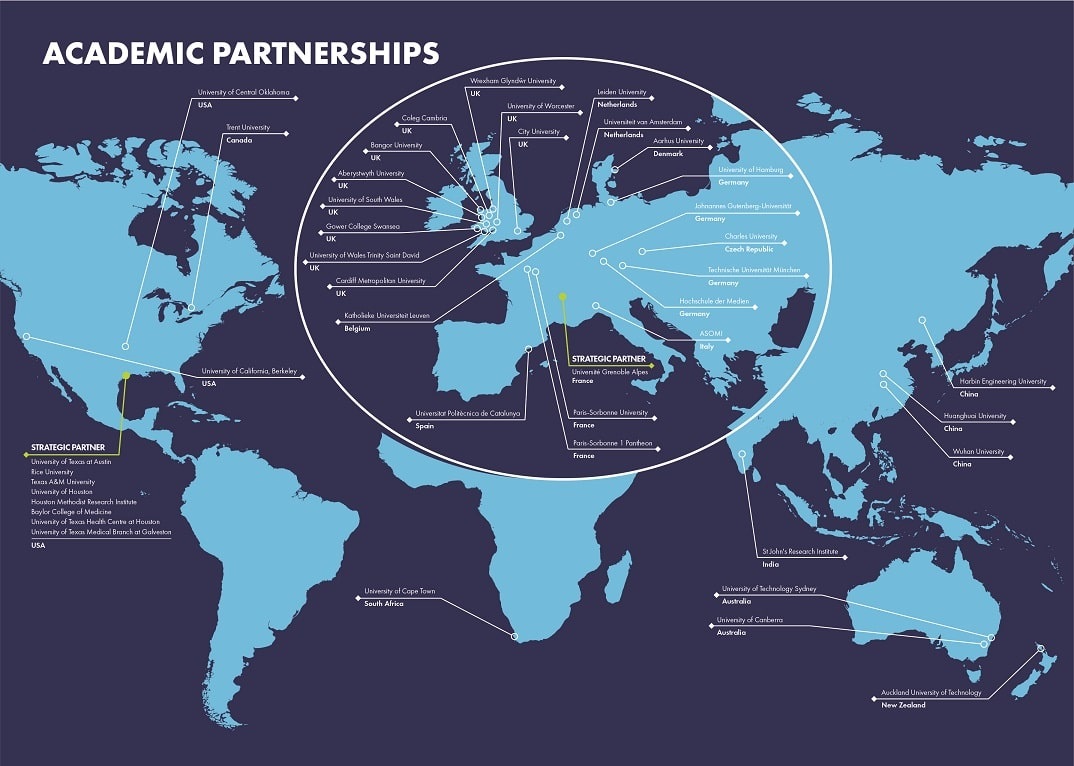 Rydym yn dod â sefydliadau o bob cwr o'r byd ynghyd i greu a datblygu rhaglenni rhyngwladol arloesol, cydweithrediadau a phartneriaethau strategol gyda phrifysgolion o safon fyd-eang. Mae'r partneriaethau rhyngwladol yn cynnwys y rhai â Grenoble Alpes, Paris Sorbonne, Prifysgol Cape Town, Prifysgol Aarhus, Prifysgol Technoleg Auckland a Sefydliad Ymchwil Fethodistaidd Houston, i enwi ond ychydig. Cliciwch i weld rhestr lawn o bartneriaethau Abertawe.
