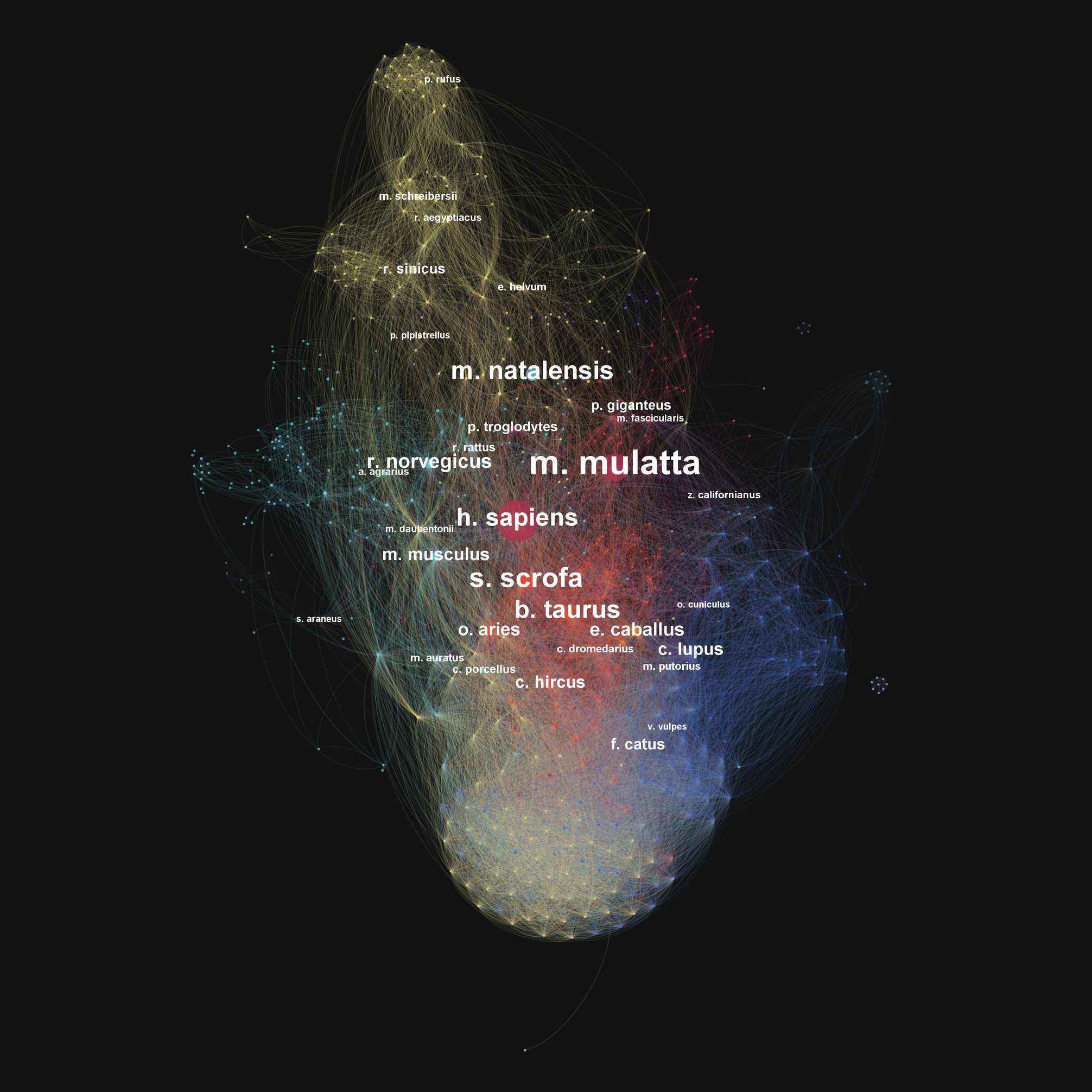 Ar gyfer astudiaeth ddiweddar ar ymlediad byd-eang rhywogaethau feirysau ymhlith pobl a mamaliaid, crëwyd modelau cyfrifiadurol, gan ddefnyddio algorithmau cymhleth, i archwilio rhywogaethau’r mamaliaid hynny sy’n gysylltiadau canolog o ran sut mae pobl a mamaliaid yn gysylltiedig, gyda llawer o’r rhywogaethau feirysau rydym yn gwybod bod pobl ac anifeiliaid yn eu rhannu.