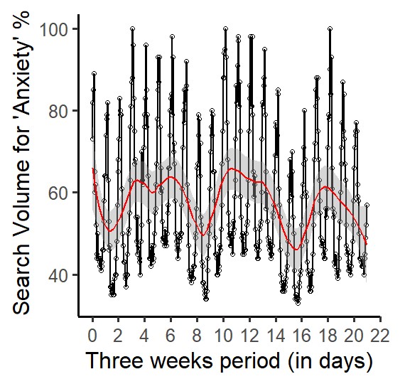 Yn gyntaf gwnaethom archwilio degau o biliynau o ymchwiliadau drwy Google ar fwy na mil o ddiwrnodau (2017-2019). Ninnau oedd y bobl gyntaf i ddarganfod bod gan nifer yr ymchwiliadau am eiriau allweddol sy’n ymwneud â thrafferthion seicolegol (megis “anxiety”, “stress”, hunanladdiad), batrwm rhythmig yn ystod y dydd, a bod cyfran helaeth yr ymchwiliadau’n digwydd gyda’r hwyr (gan gyrraedd brig am 02:00, gweler y Ffigwr). Yn yr un modd, darganfuom batrymau wythnosol (a ddisgrifir yn ‘dymhorol’ hefyd) yn yr ymchwiliadau hynny sy’n dangos yn glir effaith yr wythnos waith ar ymddygiad pobl wrth chwilio am wybodaeth ynghylch iechyd meddwl (gweler y Ffigwr). Yn bell o fod yn ddibwys, mae’r patrymau tymhorol cadarn iawn hynny yn nodweddiadol o fywyd mewn cymdeithas gysylltiedig, y mae aelodau’r gymdeithas honno wedi darganfod dulliau er mwyn mynegi’u hanhwylderau seicolegol, ac efallai chwilio am wybodaeth a chymorth.
