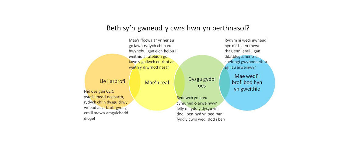 Bydd yn newid y ffordd mae’r rhaglen yn cael ei chyflenwi o fod yn rhaglen wyneb yn wyneb yn bennaf i ymgorffori rhannau ar-lein. Byddwn ni’n monitro cyngor Llywodraeth Cymru ac effaith dymhorol y feirws ac yn newid y rhaglen yn unol â hynny. Mae gyda ni lawer o gyrsiau rydym yn eu cyflenwi ar-lein ac wyneb yn wyneb ac rydyn ni’n hyderus o hyd y byddwn ni’n gallu cyflenwi rhaglen werthfawr ichi. Gan ein bod yn gwerthfawrogi cydweithredu wyneb yn wyneb yn fawr, a’i fod yn rhan bwysig o’n rhaglen, ein gobaith yw y byddwn ni yn y pen draw yn gallu dychwelyd at ein dull arferol.
