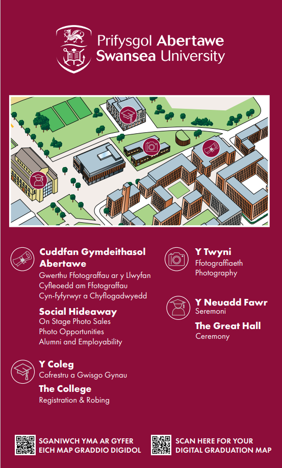 This map outlines all the key way finding points you may need when attending your Winter Graduation Ceremony at Swansea University. The Graduation preparations and ceremonies will take place across the College and The Great Hall.