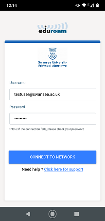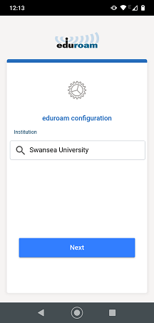 Open the geteduroam app and enter Swansea University into the institution search box and click "Next".