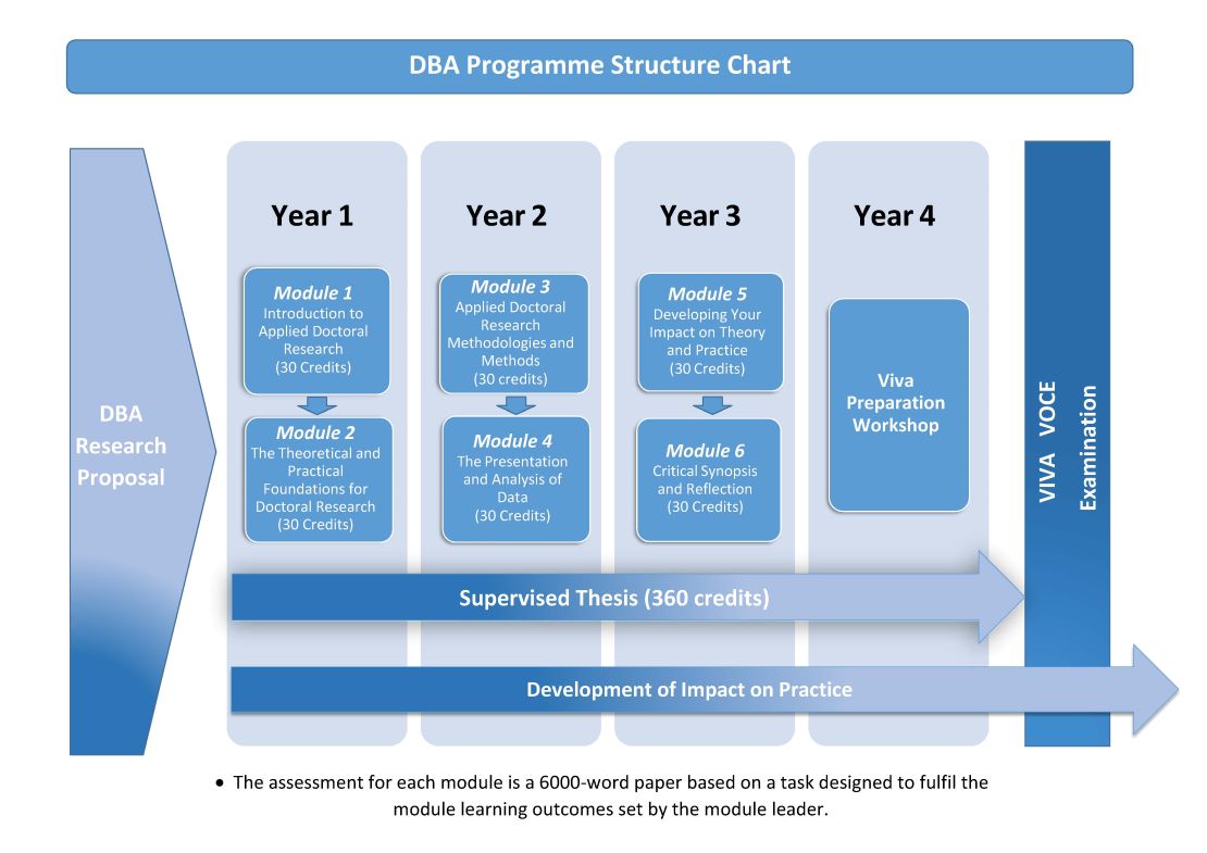 Work on the thesis begins in parallel with the taught modules. The Swansea DBA is designed to allow completion in four years.