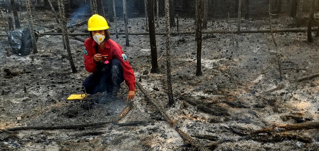Dr Cristina Santin taking charcoal samples after fire in boreal Canada. In samples from ten different fires, the researchers detected EPFR in concentrations that exceeded those typically found in soils by as much as ten to a thousand times. (Picture: Stefan Doerr)