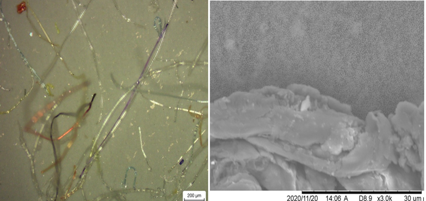 Microscope images of particles found in disposable face masks: (left) microfibres from a children's mask; (right) plastic fragments