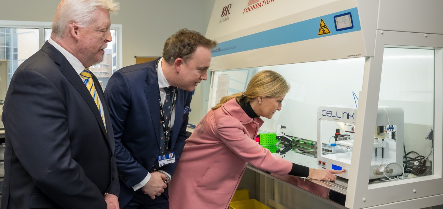 The Countess of Wessex, accompanied by lead Ambassador for the Foundation Simon Weston, toured the bespoke research lab, received a demonstration of the 3D printer and met patients who could benefit from this life-changing research including fellow Ambassadors Jaco Nel who survived sepsis with life changing consequences and Elizabeth Soffe who survived severe burns at just six months old and Tina Morgan, who survived skin cancer.