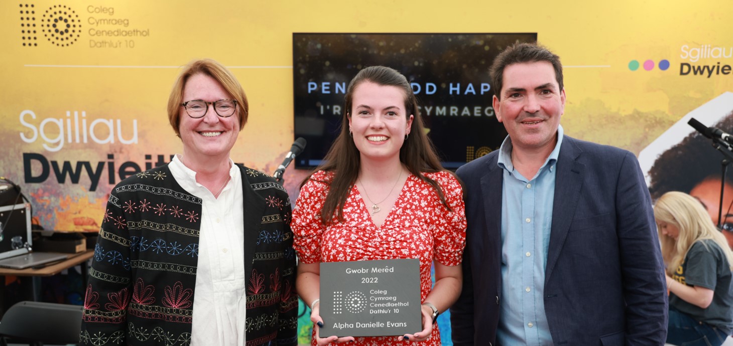Alpha Evans from Swansea University was crowned the winner of the Coleg Cymraeg Cenedlaethol's Merêd Award at the Ceredigion National Eisteddfod in August.
