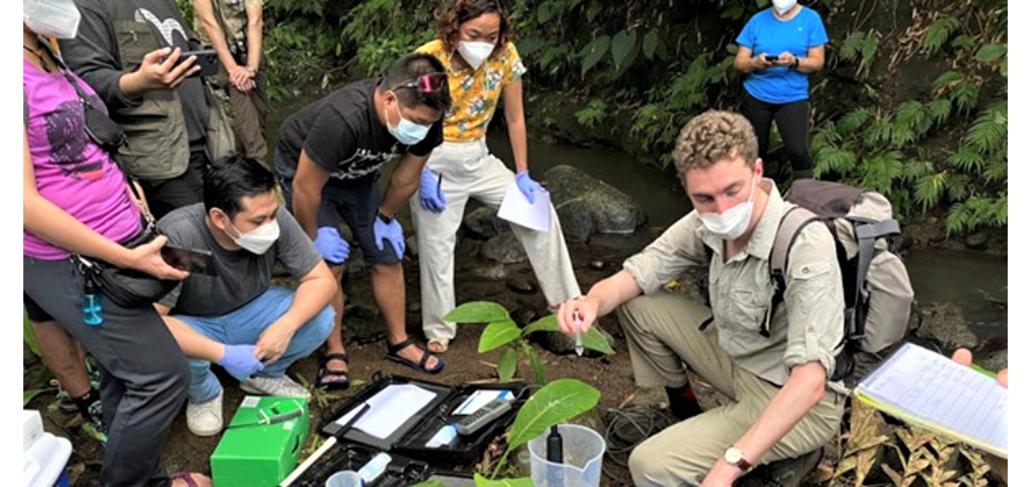 Aaron Todd (right) with Filipino colleagues. He conducted fieldwork with a team of eight researchers across two river catchments, collecting water and sediment samples