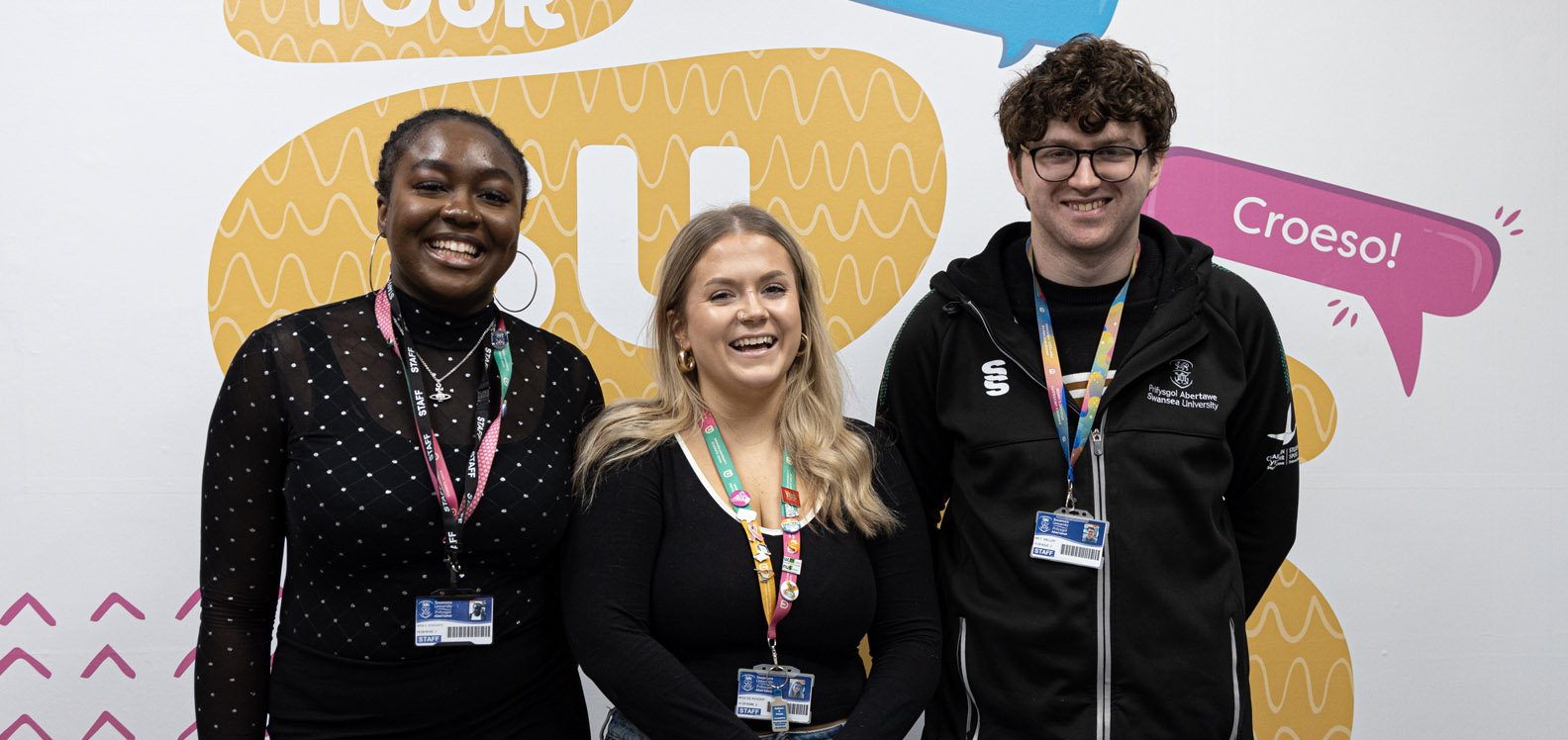 Pictured left to right: Swansea University Student's Union's Welfare Officer Abigail Egwuatu, President Esyllt Rosser, and Student Groups and Engagement Coordinator Tom Weller.