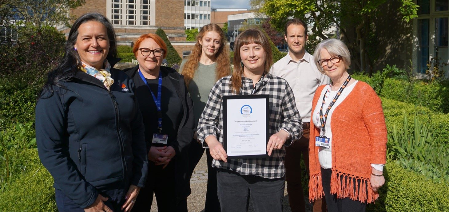 Pictured with the award (from left) Mitie General Manager, Waste and Environmental Services Isobel McGlashon; head of Campus Operations Michelle Dene, Mitie sustainability student Devyn Simeoni, Waste & Recycling Officer Fiona Wheatley, head of Sustainability Teifion Maddocks and Mitie Site Manager Christine Winstone.